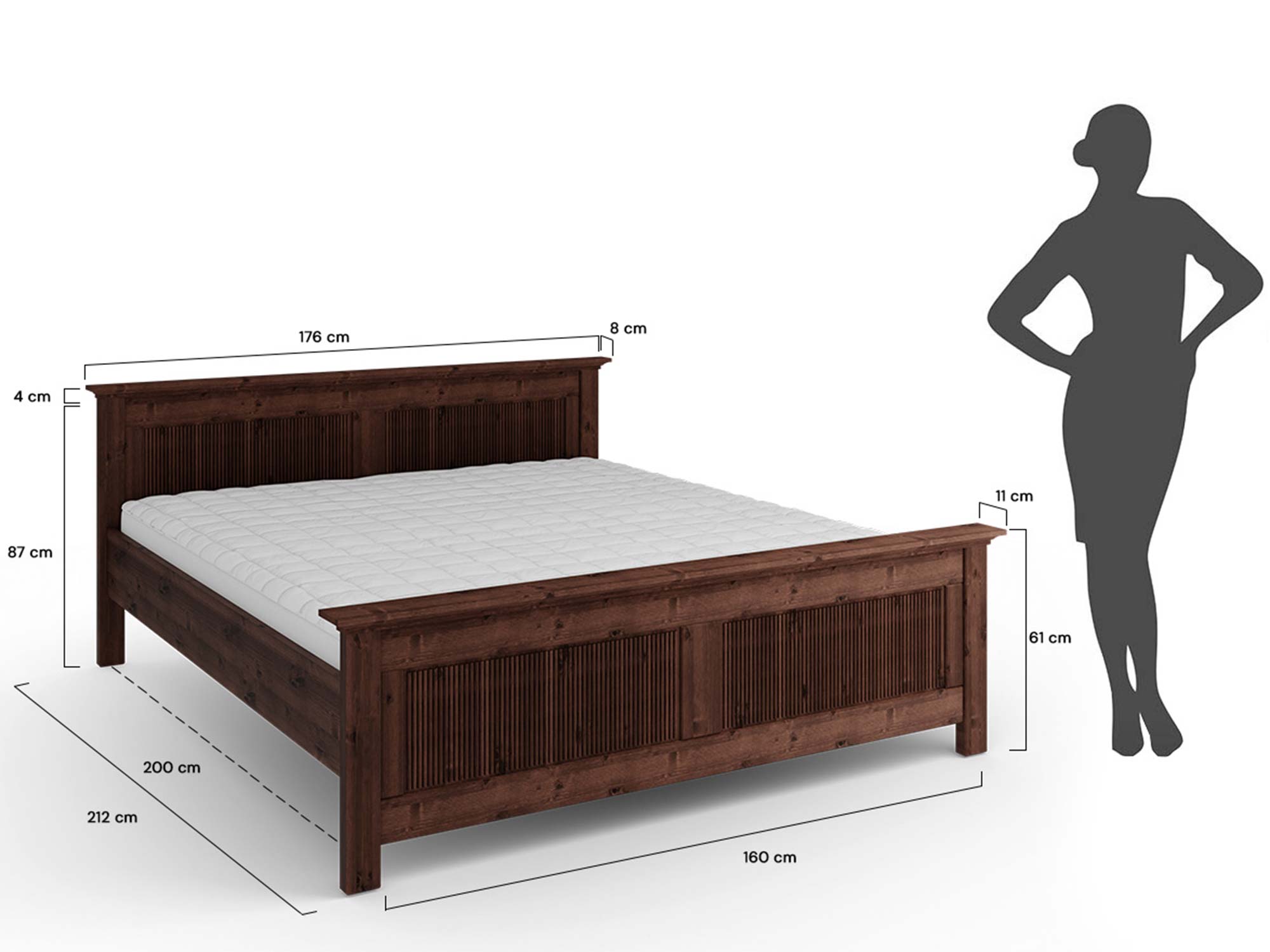 Schemat wymiarów łóżka drewnianego ciemnobrązowego z ryflowanymi panelami 176x212x87cm