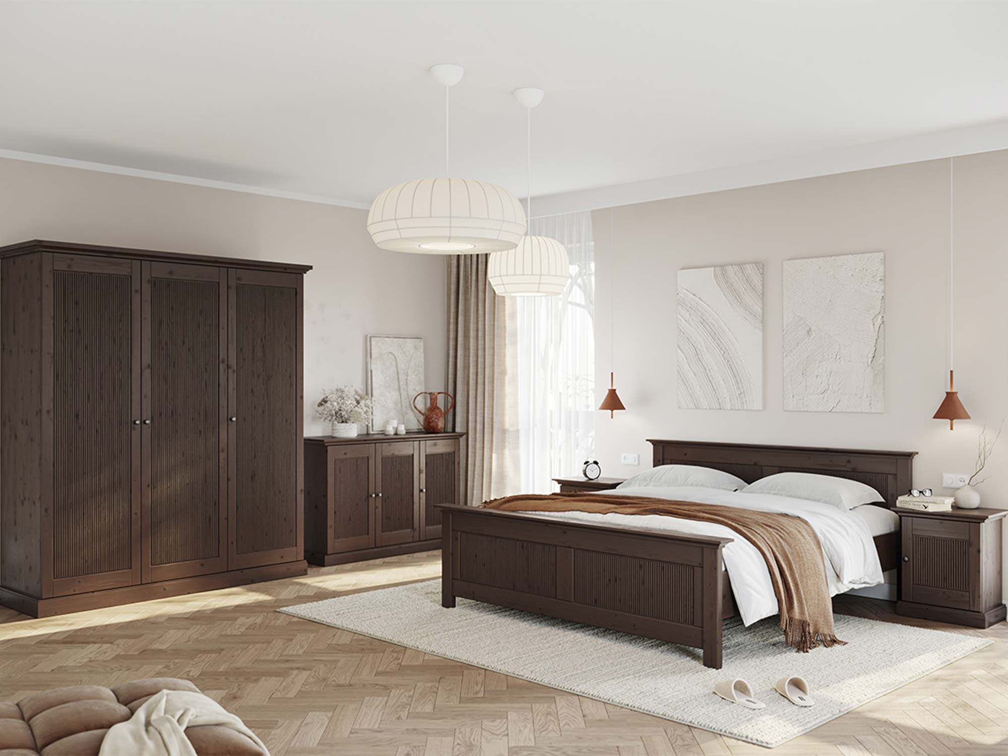 Kolekcja mebli drewnianych ciemnobrązowych w aranżacji sypialni z łóżkiem i szafą