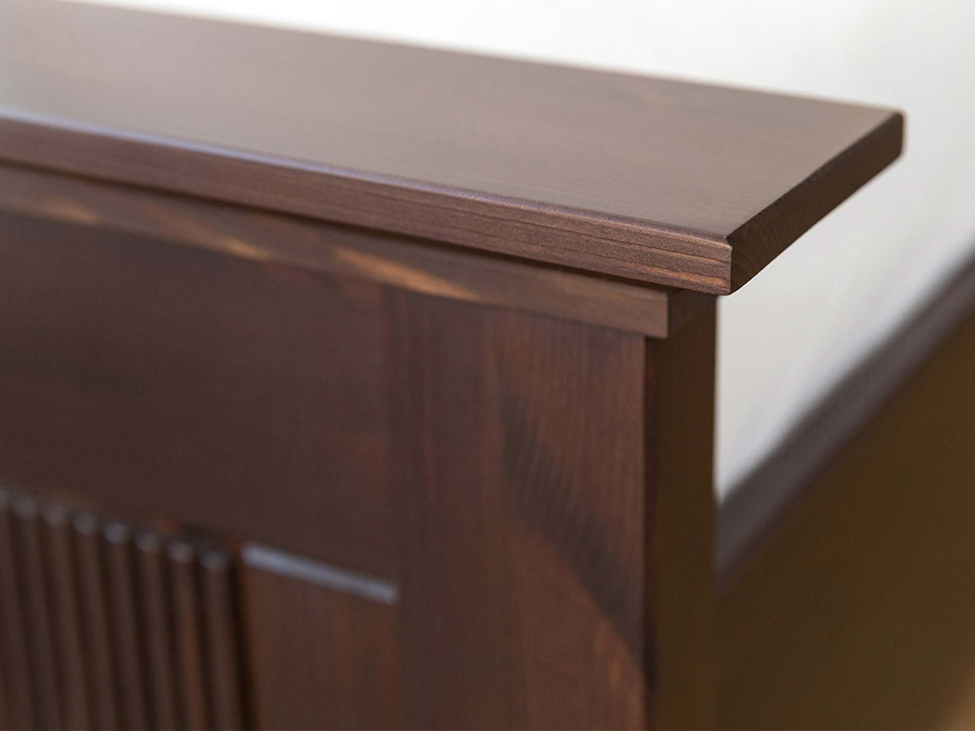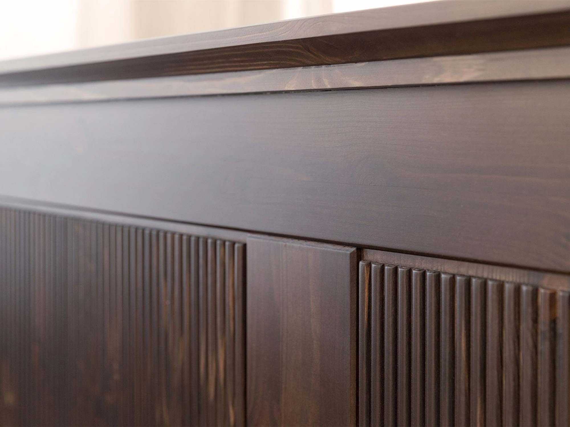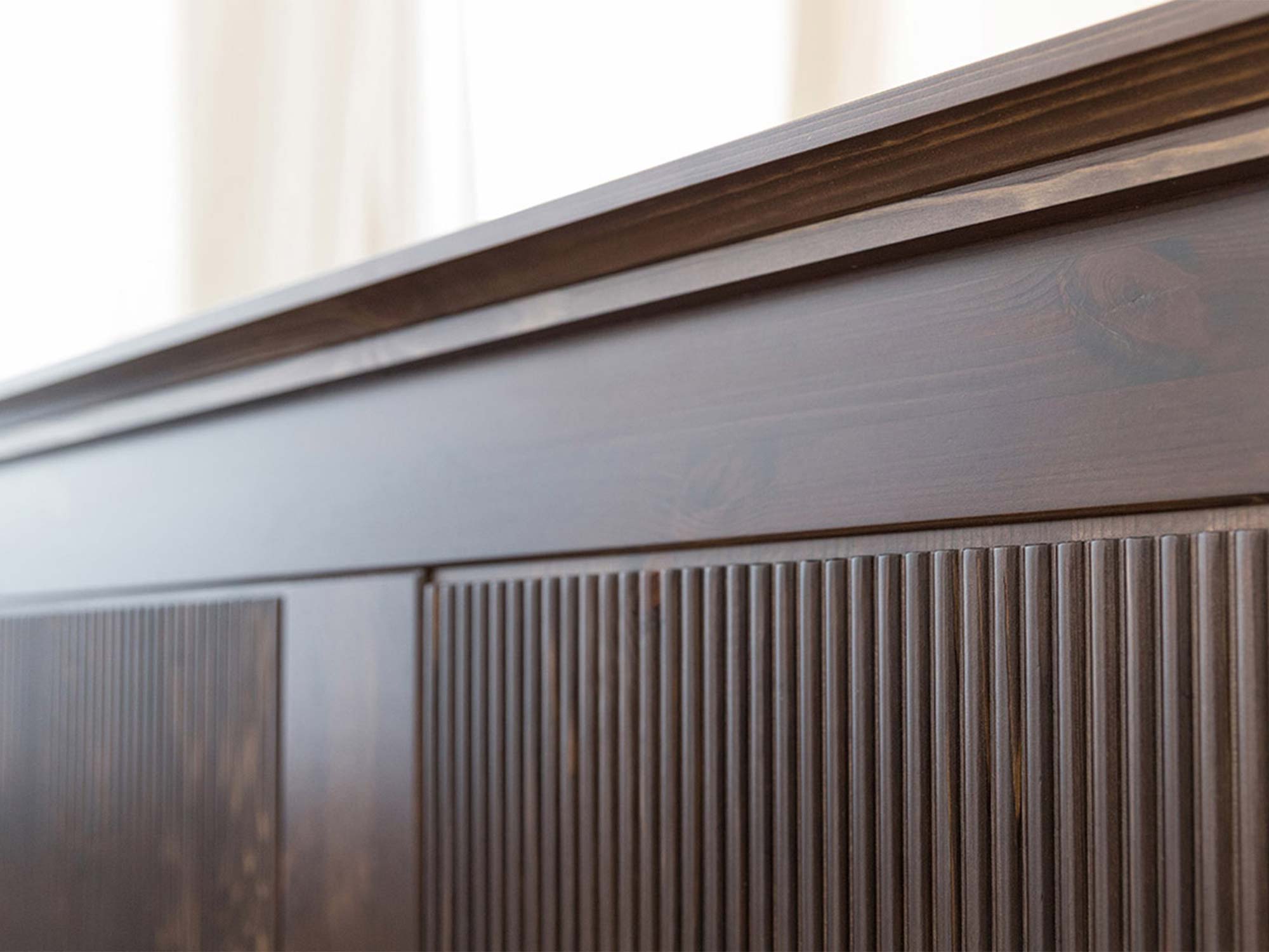 Detal górnego gzymsu mebla drewnianego ciemnobrązowego z ryflowanymi panelami
