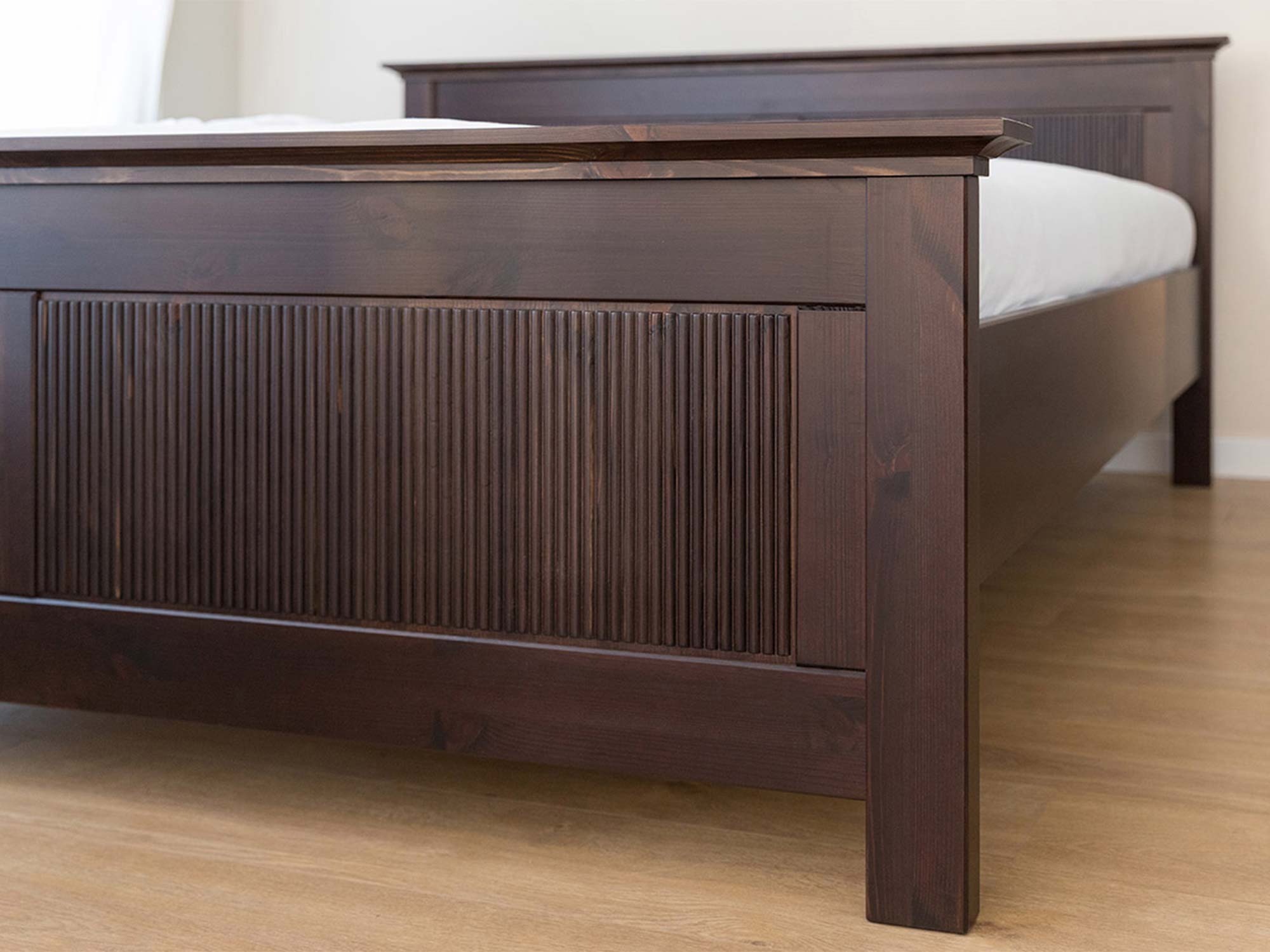Detal nóżki i ramy łóżka drewnianego ciemnobrązowego z ryflowanym panelem