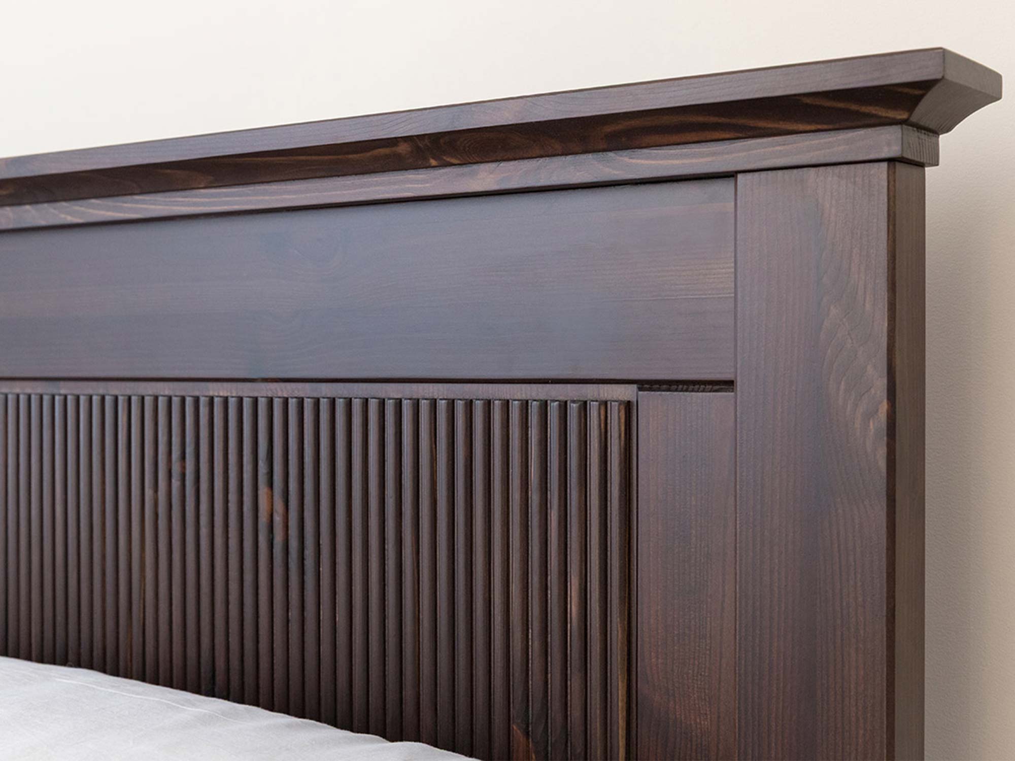 Detal zagłówka łóżka drewnianego ciemnobrązowego z ryflowanymi panelami zbliżenie