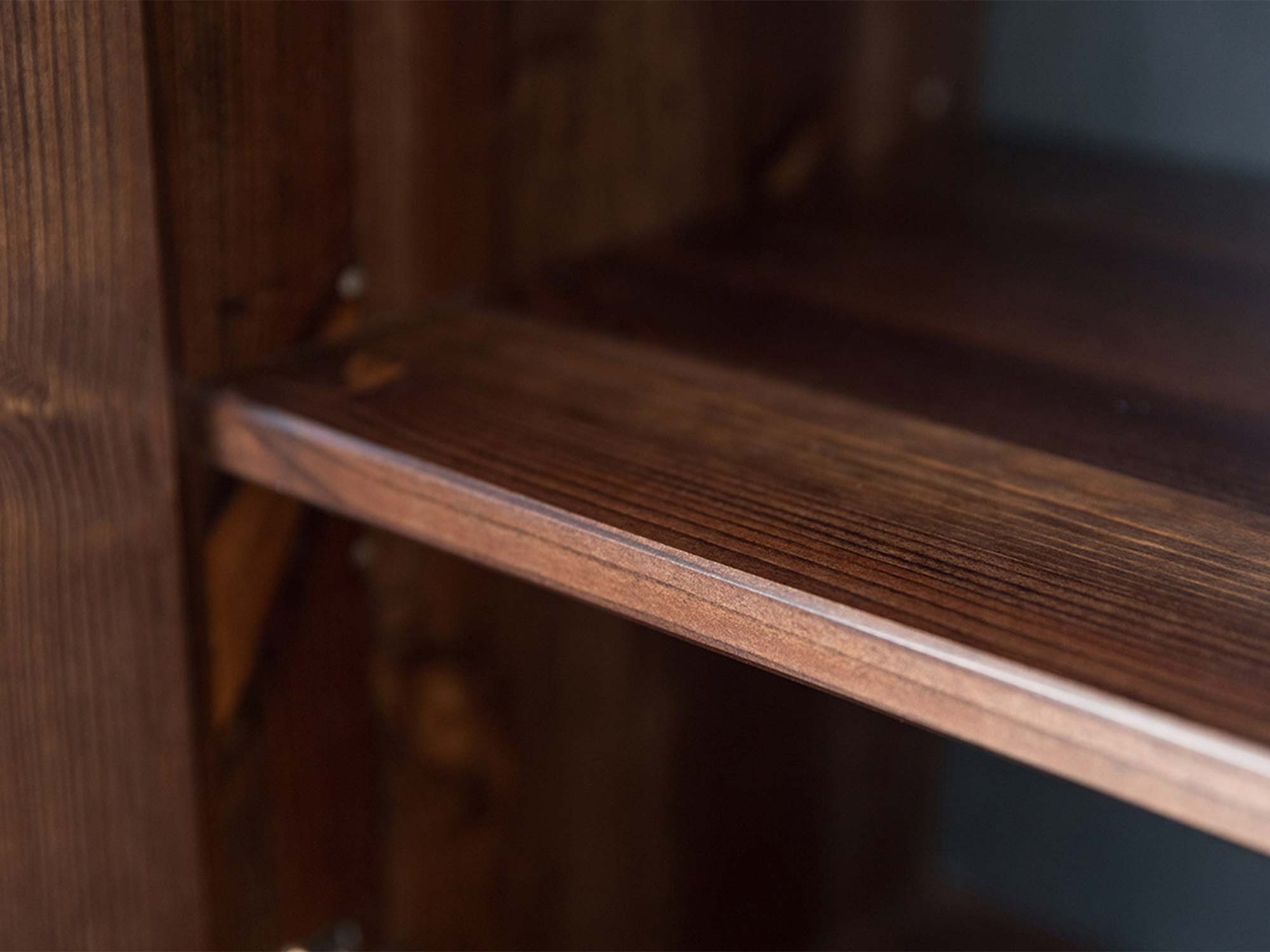 Detal półki drewnianej ciemnobrązowej z naturalnym usłojeniem w szafie zbliżenie