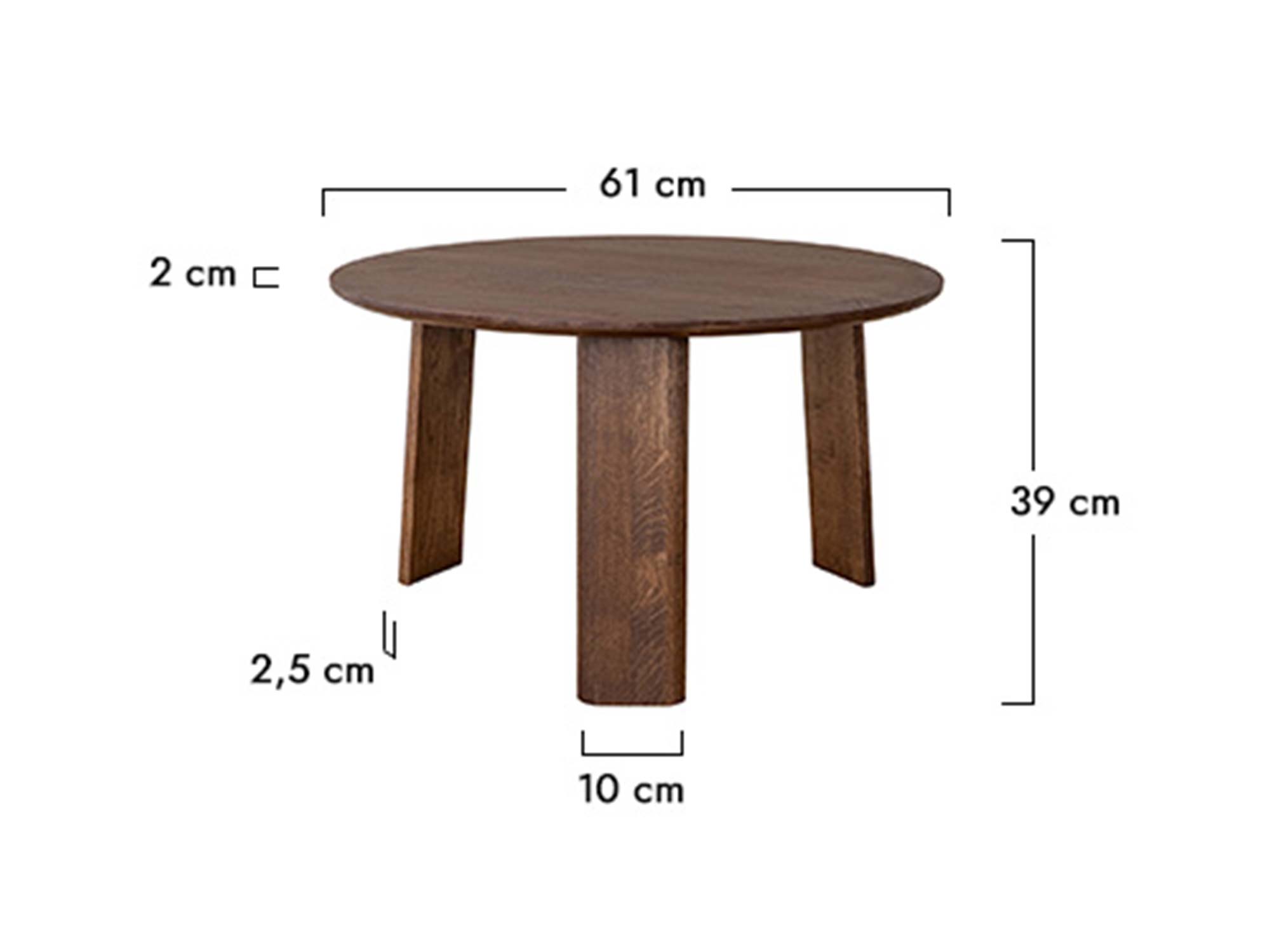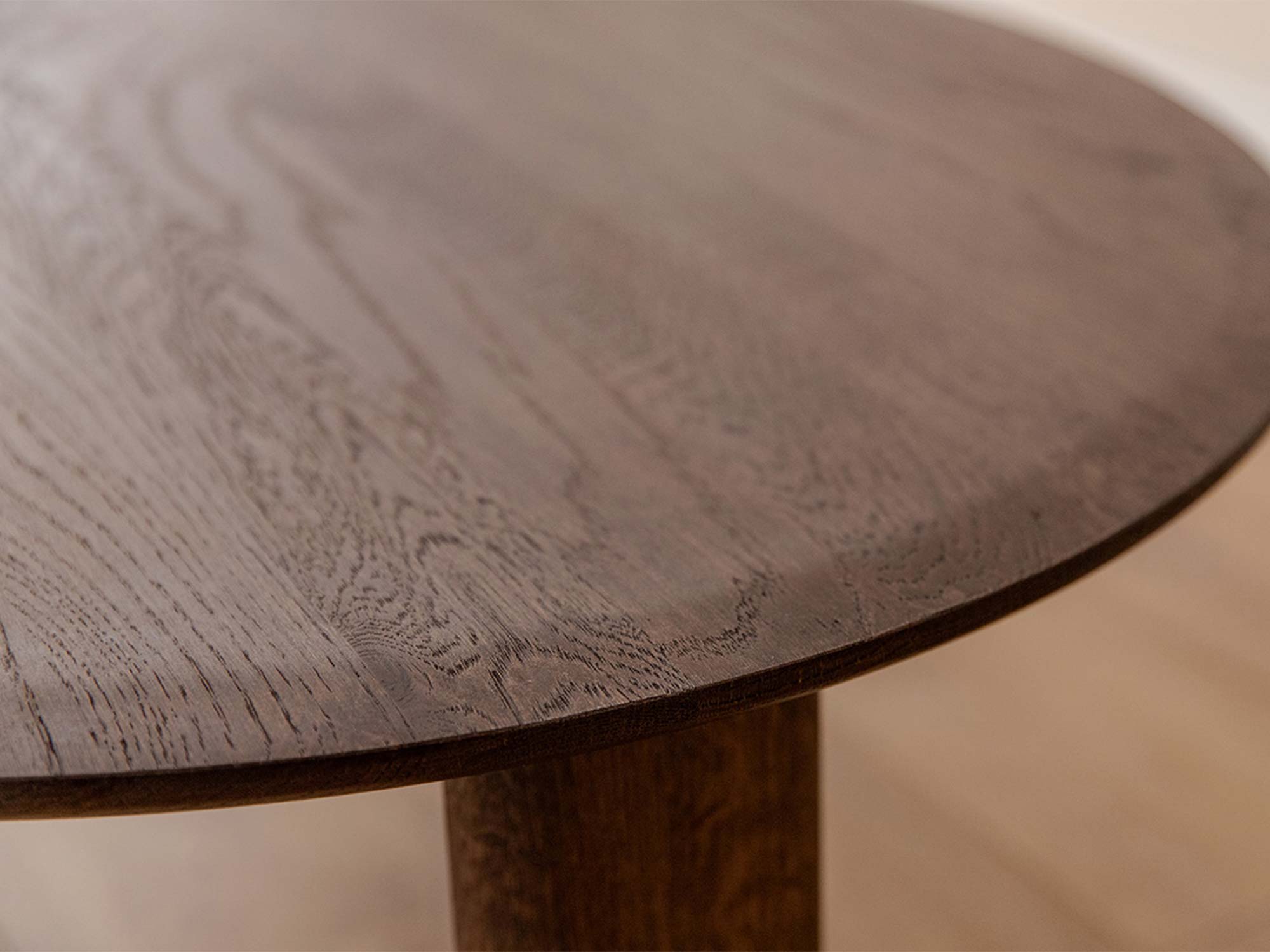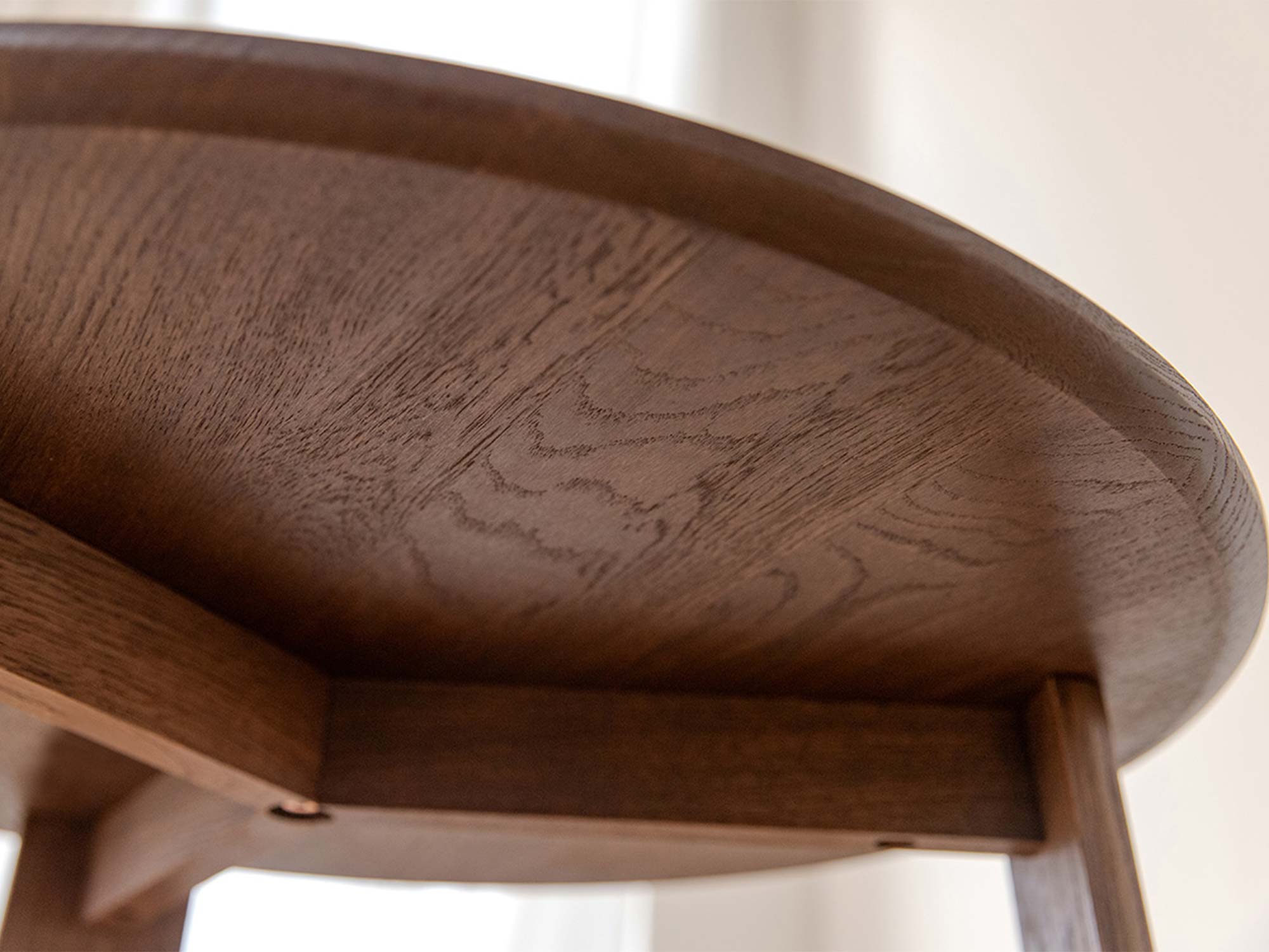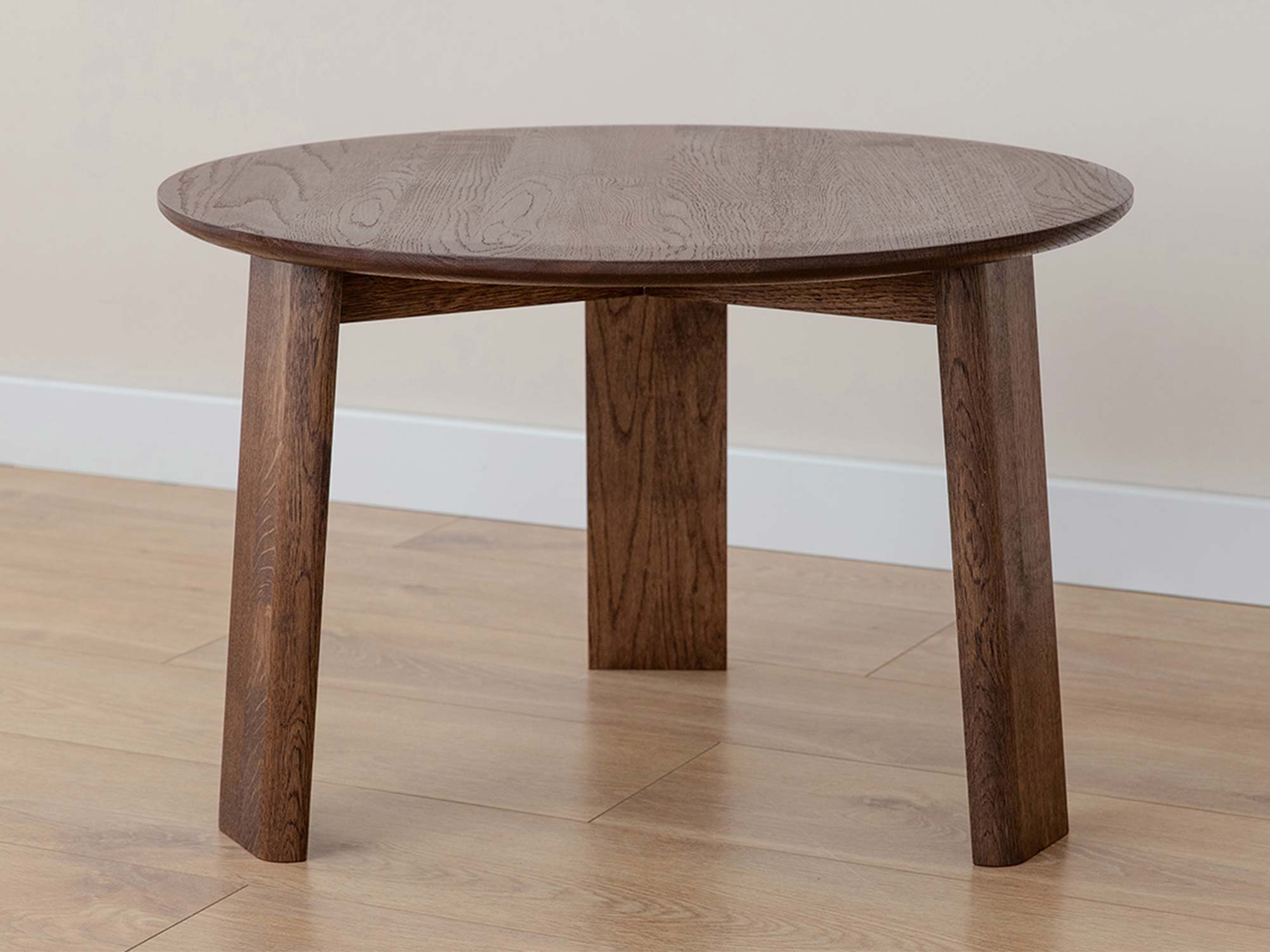 Trzy stabilne, a przy tym wizualnie lekkie nogi nadają bryle harmonii i zapewniają pewne podparcie blatu. Okrągły kształt sprzyja ergonomii: łatwo wsunąć stolik przy sofę, fotel, narożnik czy łóżko. Z kolei zaokrąglone krawędzie są przyjazne dla dłoni i bezpieczniejsze w intensywnie użytkowanych strefach domowych.
