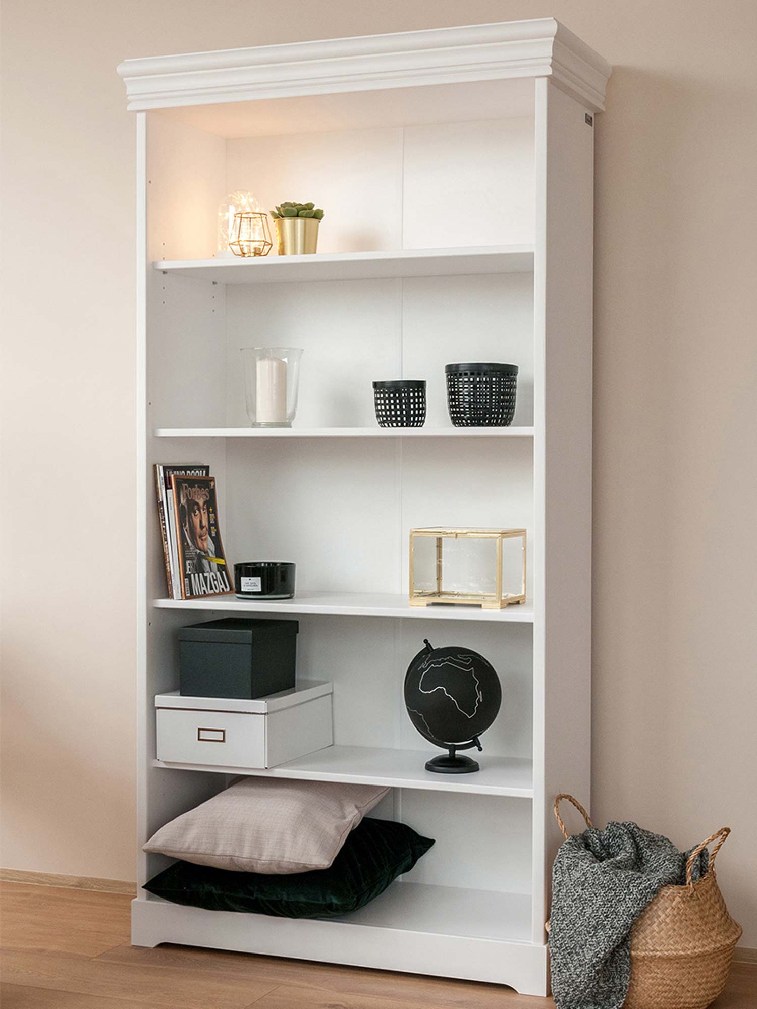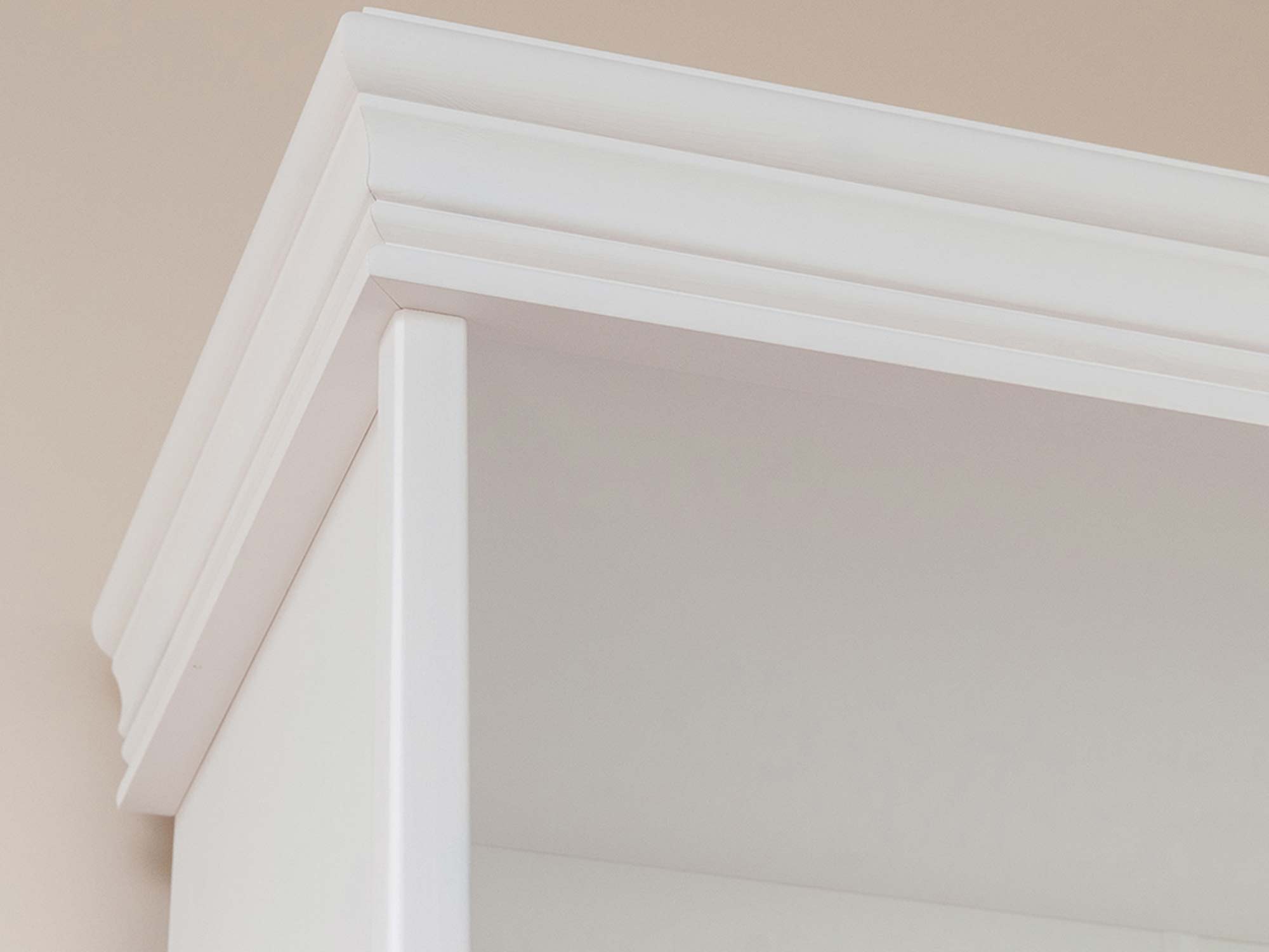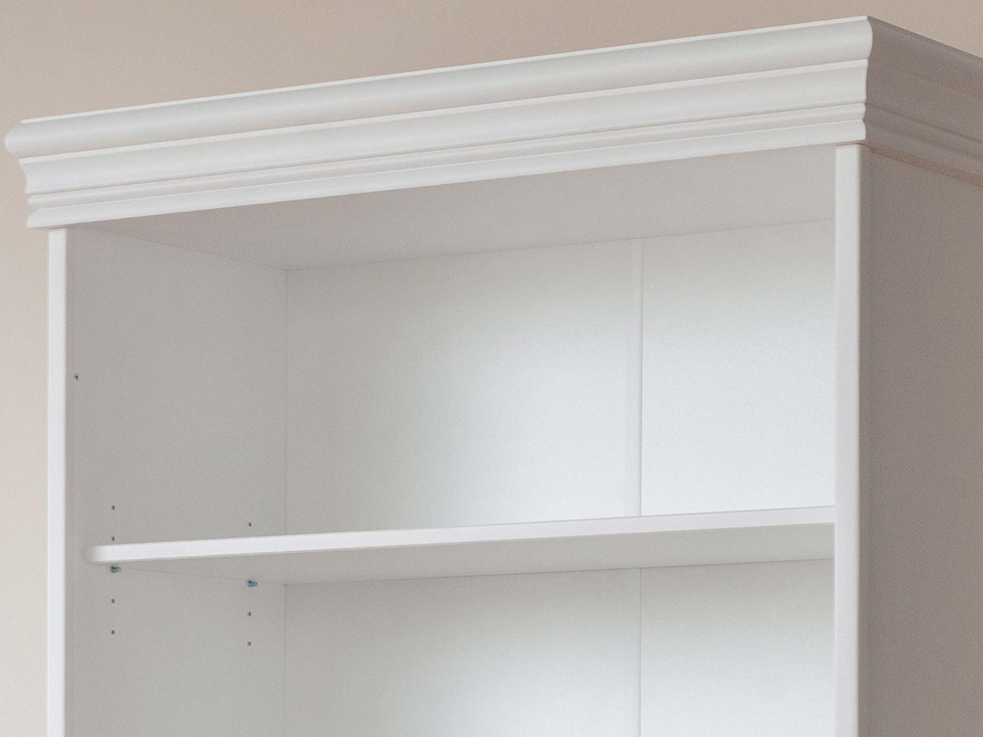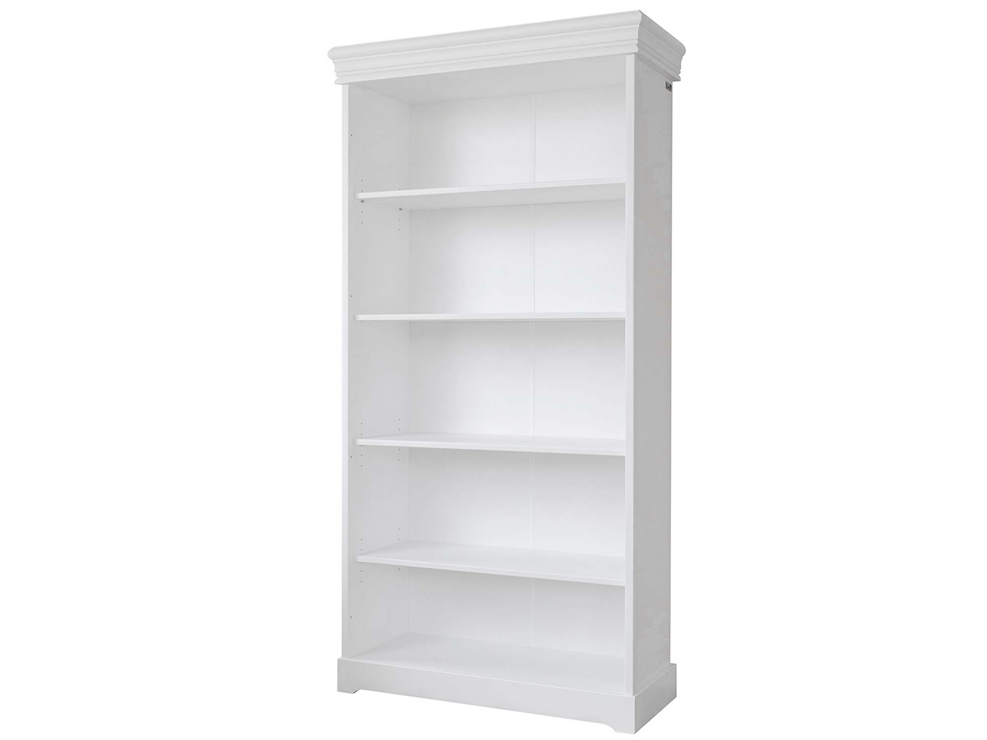 Prezentowany model to nie tylko ozdoba wnętrza, ale przede wszystkim niezwykle praktyczny mebel do przechowywania. Wysoka konstrukcja wyposażona w cztery solidne półki pozwala na wygodne rozmieszczenie pokaźnej kolekcji książek, segregatorów z dokumentami lub ozdobnych bibelotów. Stylistykę mebla dopełniają dekoracyjne wieńce, które sprawiają, że mimo swoich gabarytów, regał prezentuje się lekko i szykownie. Jest to propozycja, która z powodzeniem odnajdzie się zarówno w przytulnym salonie, jak i w eleganckiej jadalni czy domowym biurze.