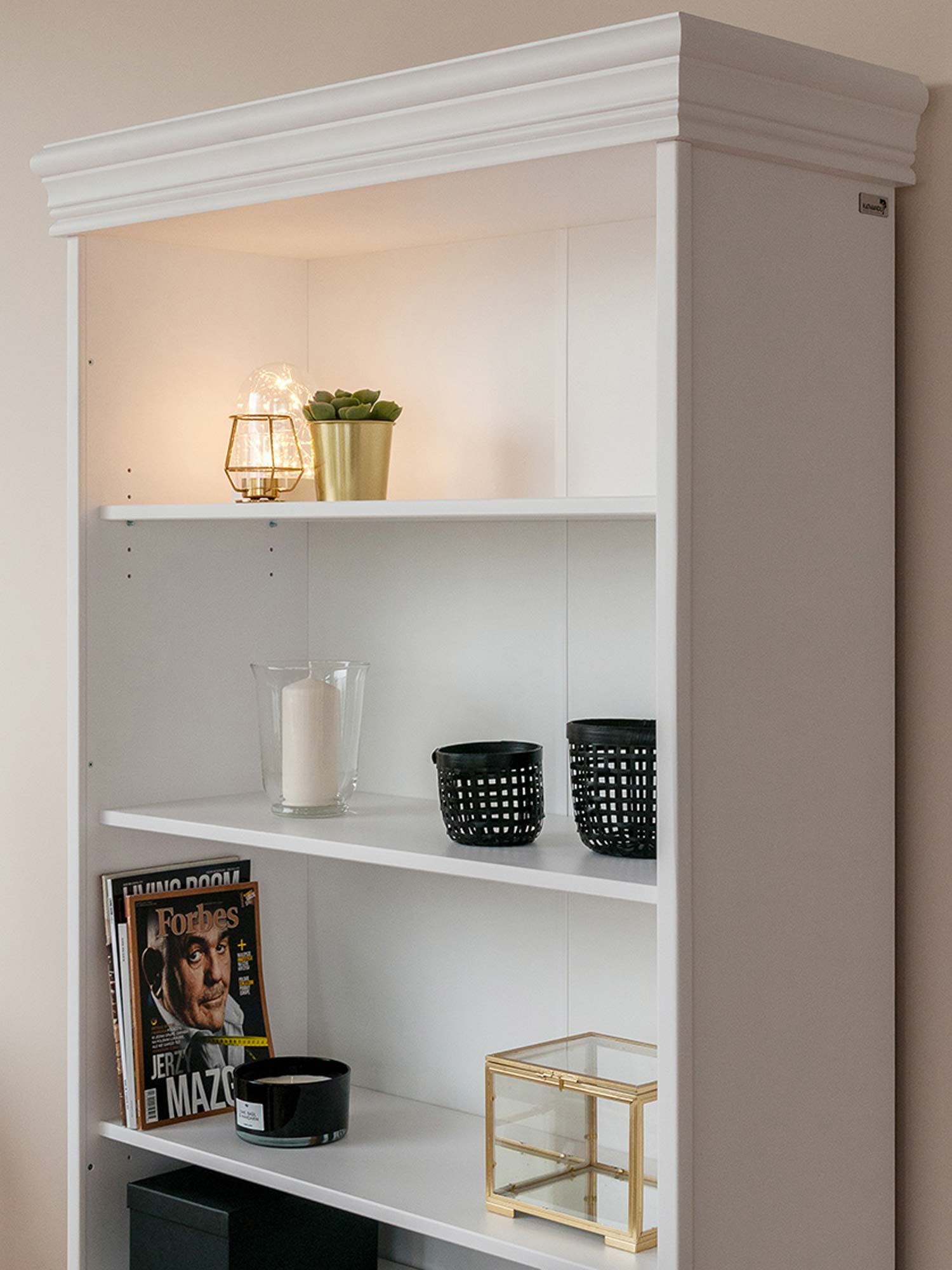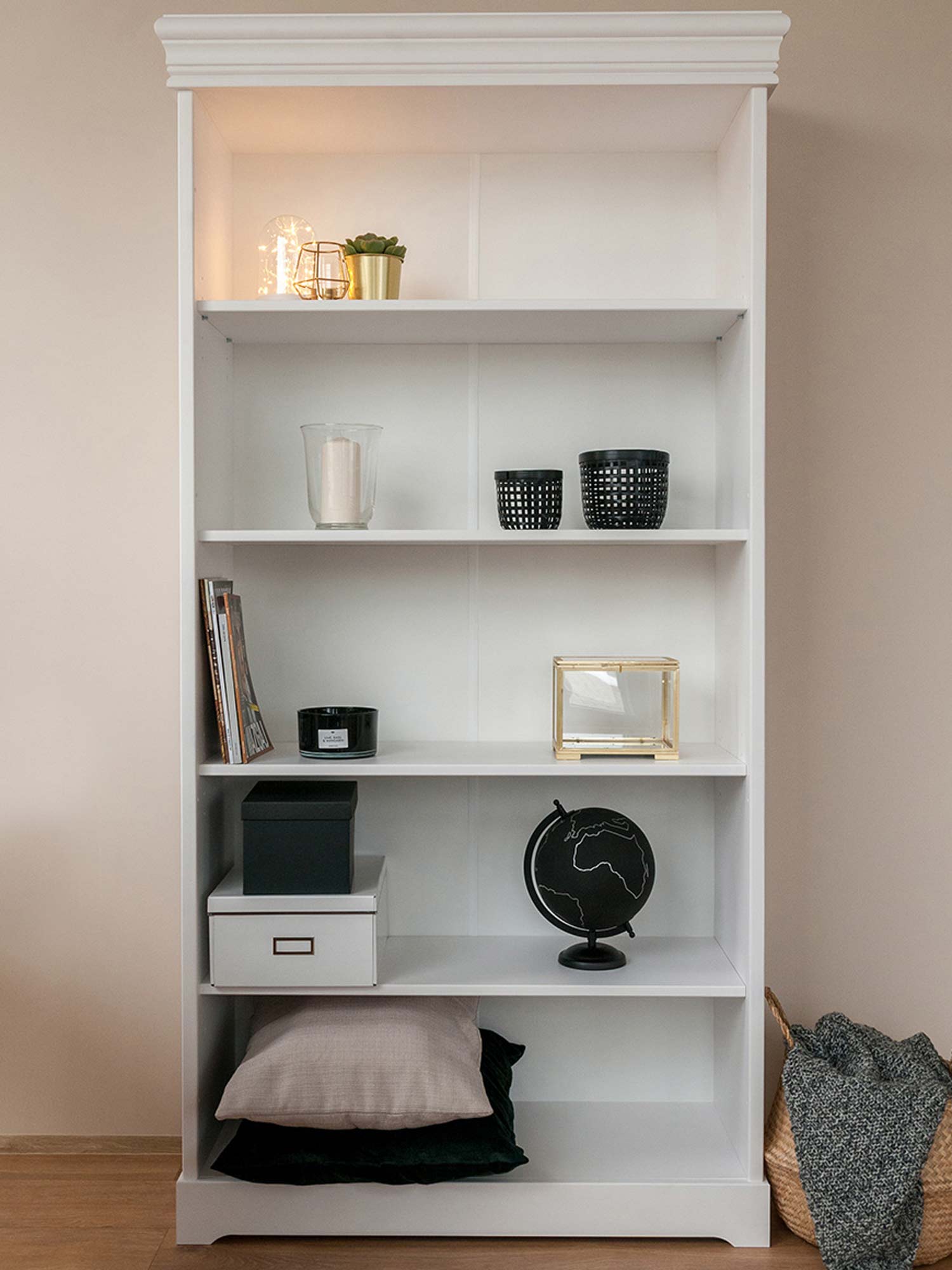 ✓ Pojemne Półki Cztery głębokie przestrzenie idealne na domową biblioteczkę. |