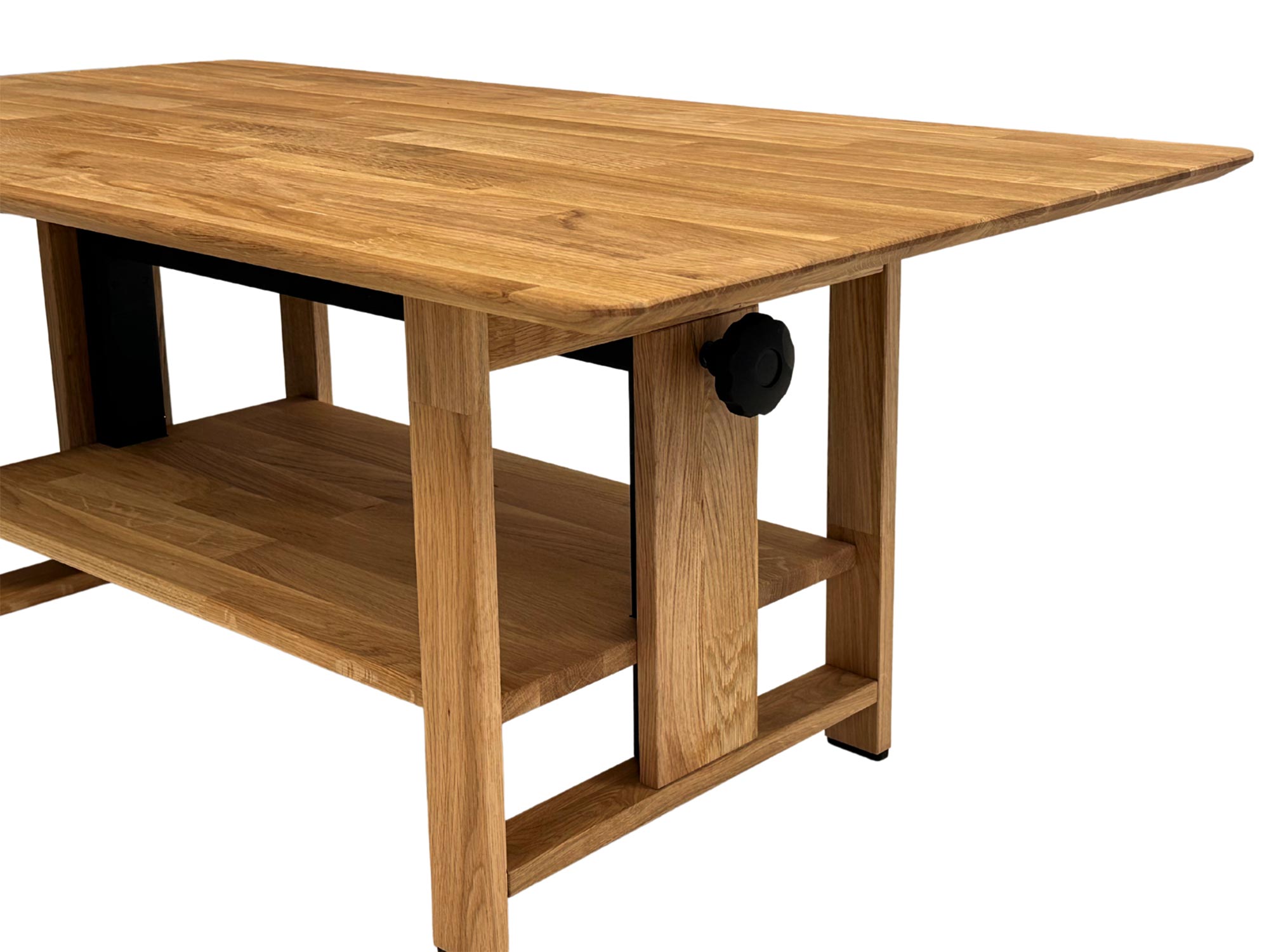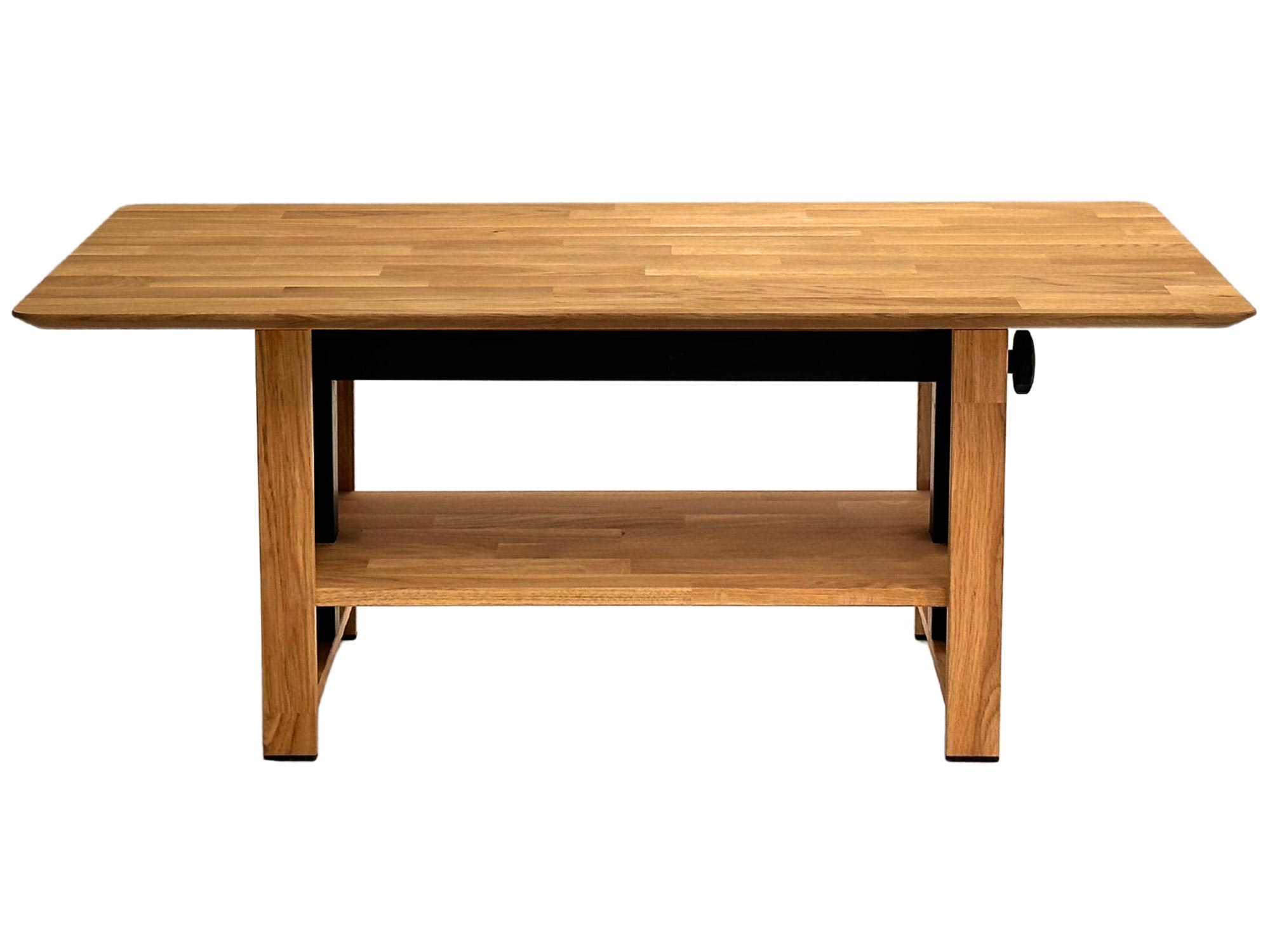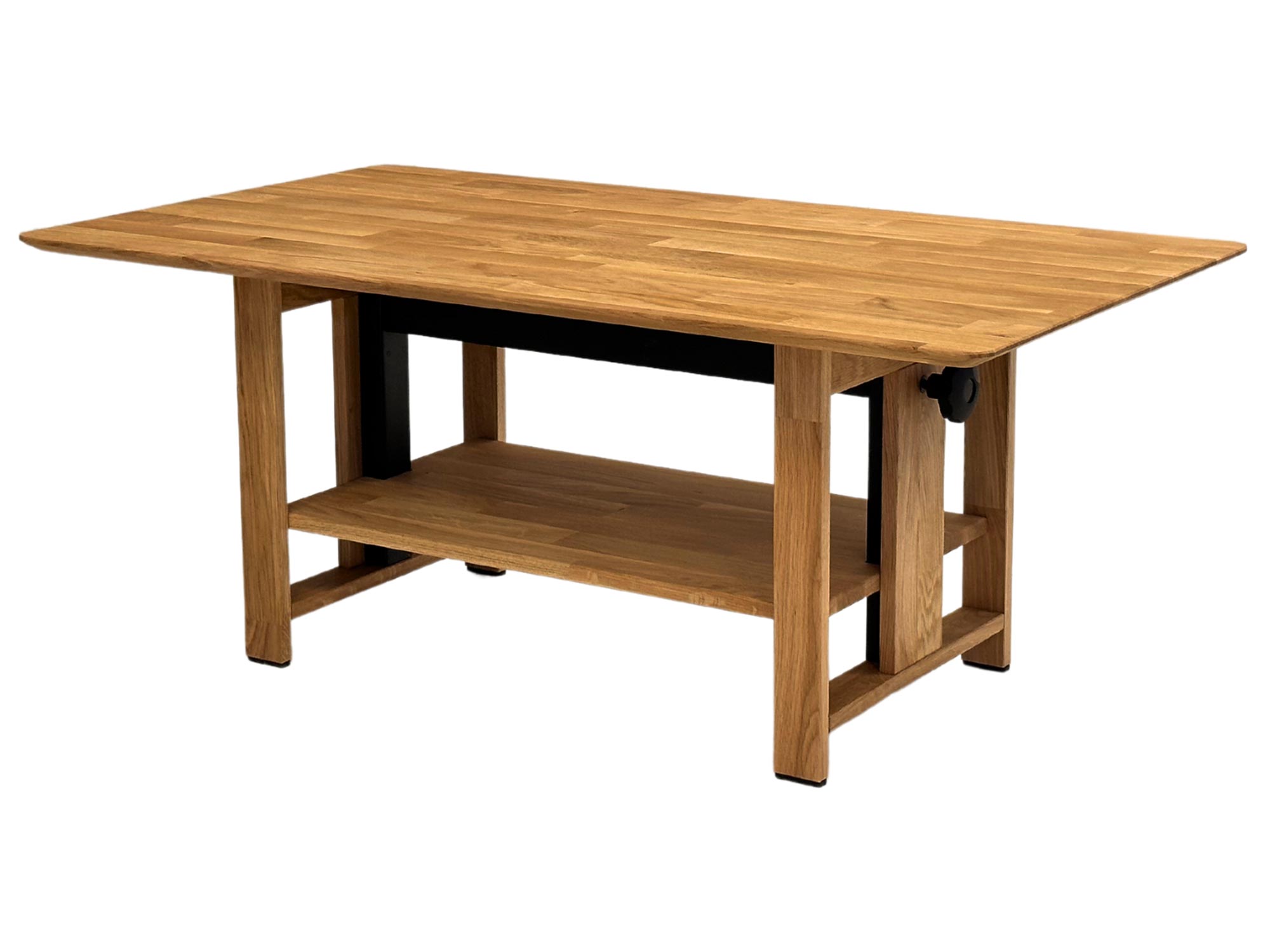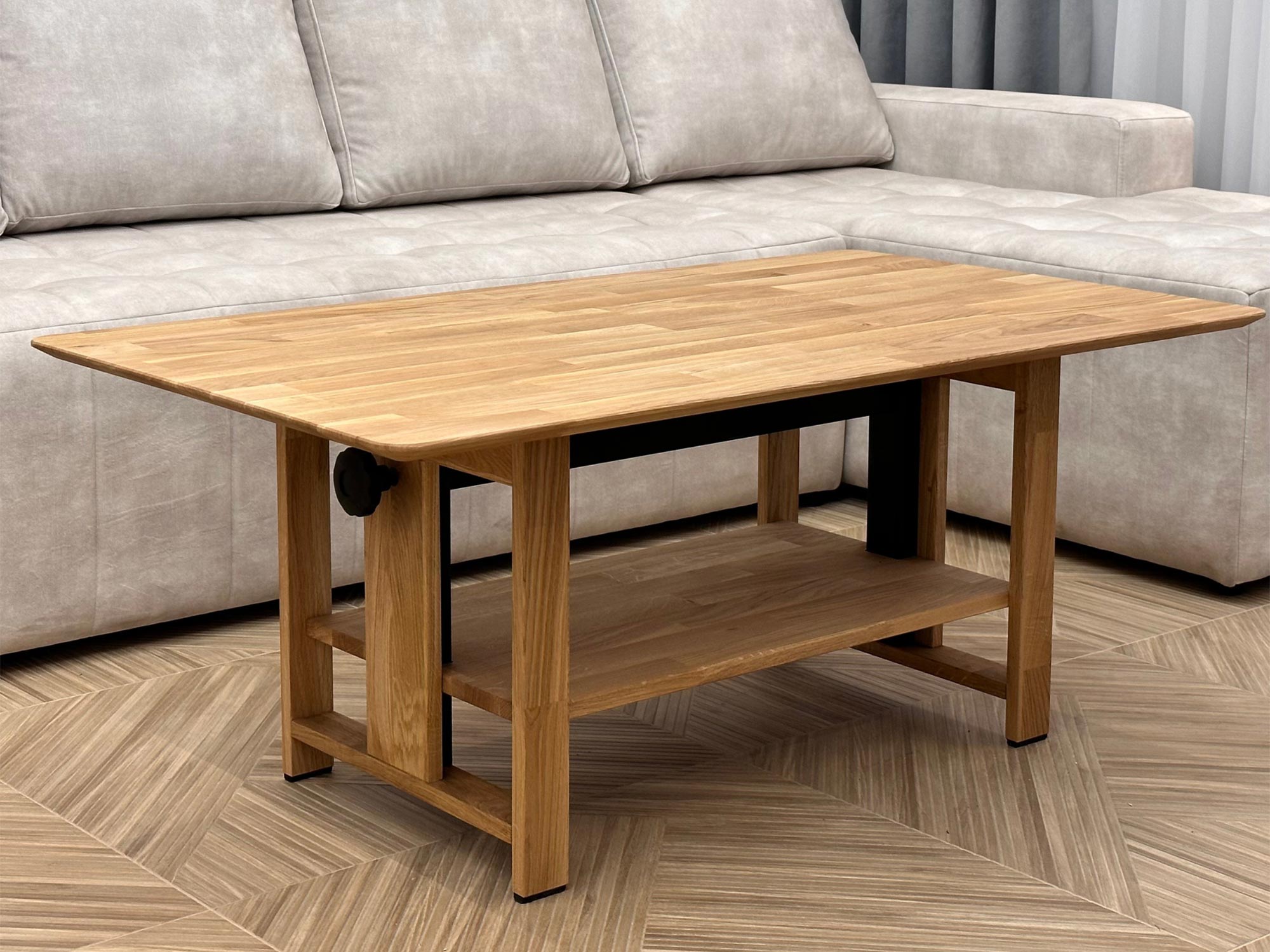 Kluczowym atutem tego modelu jest materiał, z którego został wykonany – lite drewno dębowe zabezpieczone olejem. Taki sposób impregnacji nie tylko chroni powierzchnię przed zabrudzeniami, ale także podkreśla naturalne piękno surowca, eksponując jego unikalne usłojenie i ciepłą kolorystykę. Specjalnie zaprojektowany, cięty blat wprowadza do wnętrza efekt ażurowości, dzięki czemu mebel, mimo swojej solidności, nie przytłacza optycznie pomieszczenia. Całość osadzona jest na stabilnej konstrukcji, w której drewniane elementy harmonijnie współgrają z czarnym mechanizmem podnoszenia, tworząc spójną, industrialną całość.