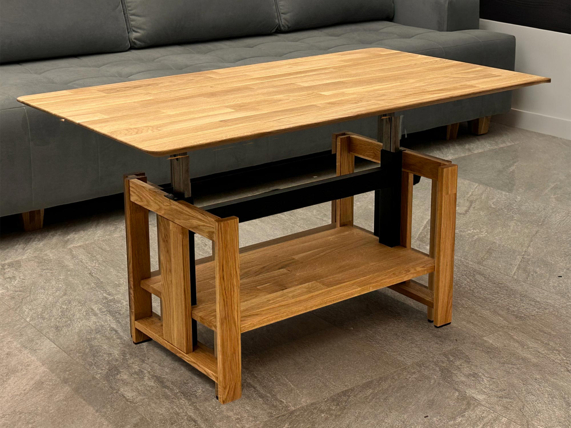Prezentowany model to wyjątkowa propozycja dla osób, które cenią nowoczesne stoliki kawowe łączące w sobie estetykę z ponadprzeciętną funkcjonalnością. Mebel ten doskonale odnajdzie się we wnętrzach urządzonych w stylu loftowym, industrialnym oraz nowoczesnym, stanowiąc ich centralny punkt. Konstrukcja opiera się na solidnym stelażu oraz elementach wykonanych z wysokiej jakości drewna dębowego, które zostało wykończone naturalnym olejem. Charakterystyczny, specjalnie cięty blat nadaje bryle lekkości i ażurowego wyrazu, co wyróżnia ten projekt na tle standardowych rozwiązań. Dzięki innowacyjnemu mechanizmowi podnoszenia blatu, użytkownik zyskuje możliwość wygodnej pracy z laptopem lub spożywania posiłków bez konieczności wstawania z kanapy. Jest to inwestycja w trwałość i design, który nie tylko zdobi przestrzeń, ale realnie podnosi komfort codziennego życia w salonie.