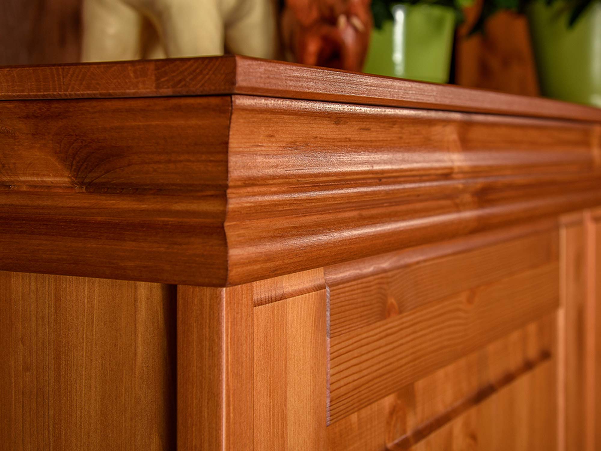 Prezentowana szafa została wykonana z dbałością o każdy szczegół, wykorzystując jako główny surowiec lite drewno sosnowe. Jest to materiał ceniony za swoją sprężystość oraz antystatyczne właściwości, co czyni go przyjaznym dla alergików. Powierzchnia drewna pokryta jest ekologicznym woskiem, który nie tylko zabezpiecza mebel, ale także eksponuje unikalny rysunek słojów i sęków, nadając każdej sztuce indywidualny charakter. Stylistykę mebla wzbogacają ozdobne wieńce oraz cokół, a delikatne frezowania nawiązują do estetyki prowansalskiej, dzięki czemu szafa staje się centralnym punktem aranżacji wnętrza.