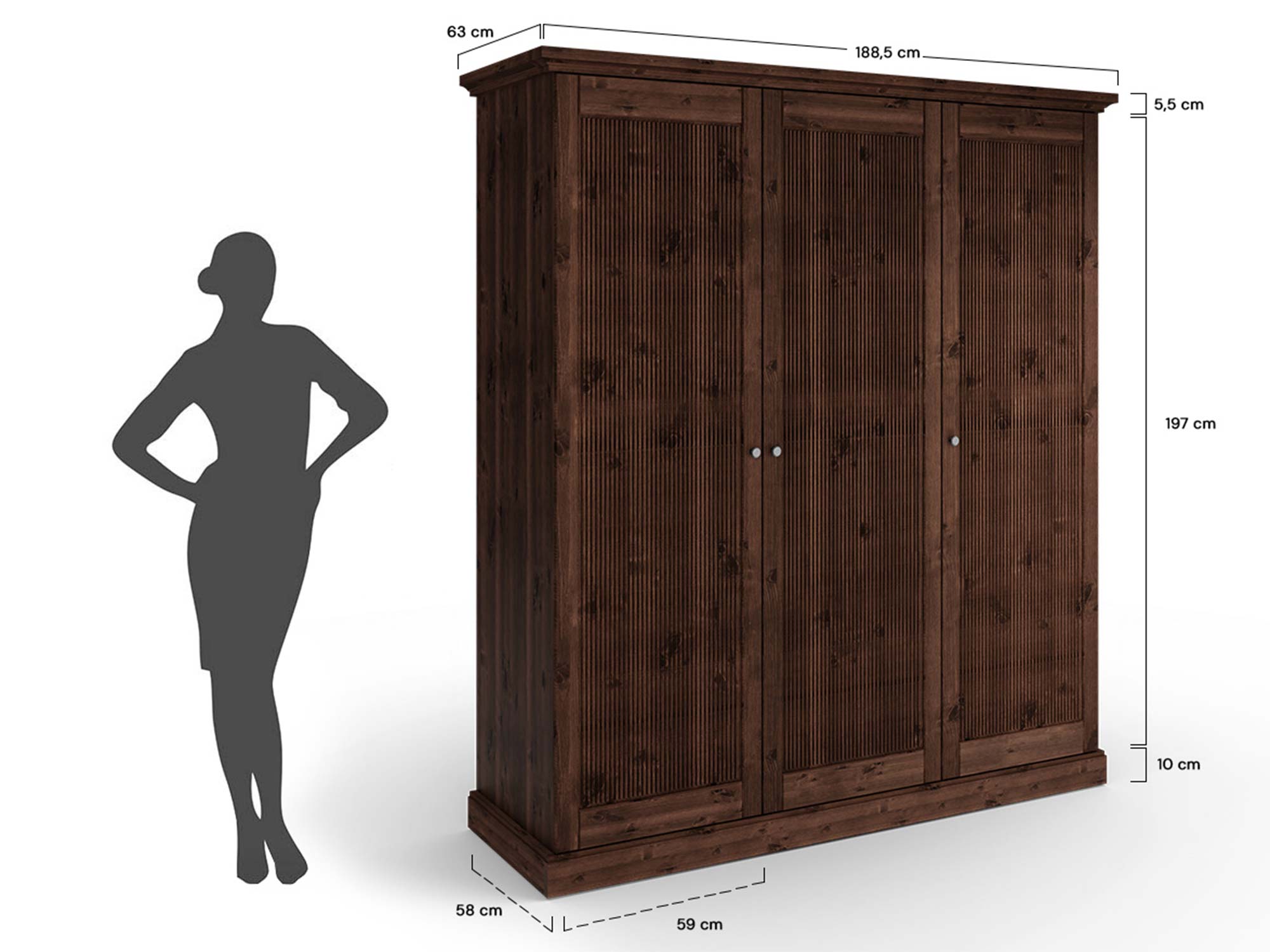 Prezentowana szafa to wyjątkowy element, który wzbogaca ekskluzywne kolekcje mebli o nutę prowansalskiego wdzięku połączonego z nowoczesną funkcjonalnością. Mebel wykonano z litego drewna sosnowego, które pokryto ekologiczną farbą wodną w głębokim odcieniu tabacco, zachowując widoczną strukturę słojów dzięki 70-procentowemu kryciu. Solidna, trójskrzydłowa konstrukcja o szerokości 188,5 cm zapewnia imponującą przestrzeń do przechowywania, idealną do sypialni lub przestronnej garderoby. Dekoracyjne frezowania oraz biżuteryjne uchwyty w kolorze starego srebra nadają bryle lekkości, mimo jej pokaźnych gabarytów. To inwestycja w trwałość i ponadczasowy styl, który wprowadza do wnętrza harmonię oraz ciepły, naturalny klimat.
