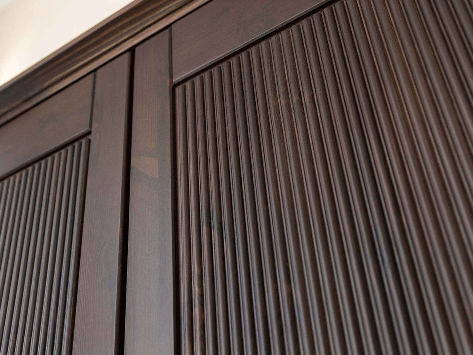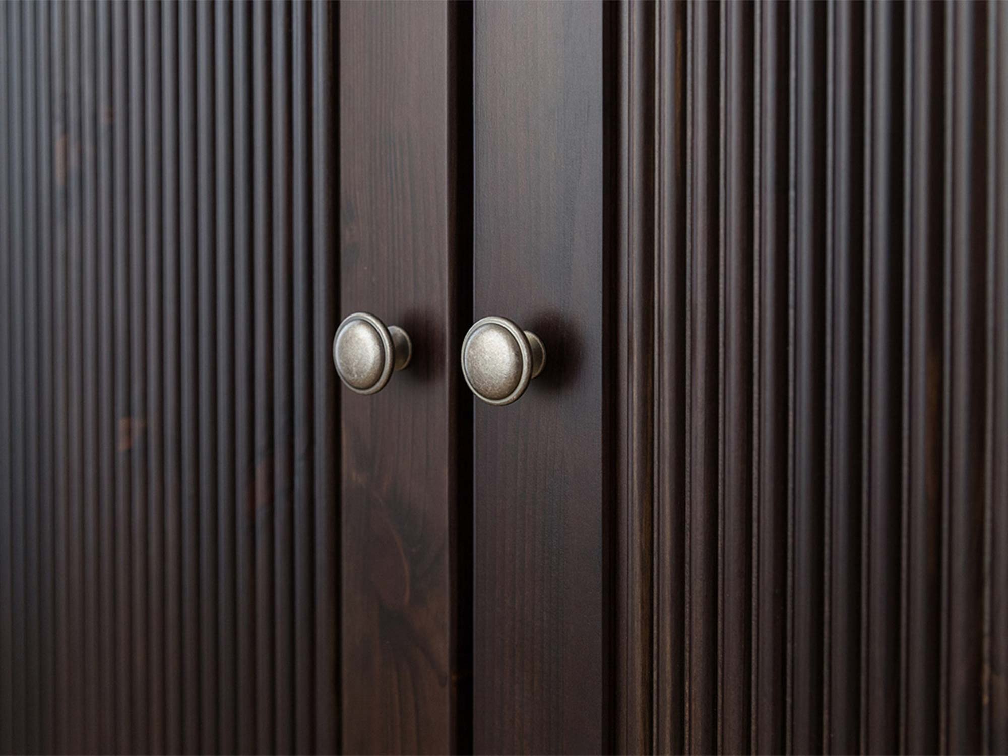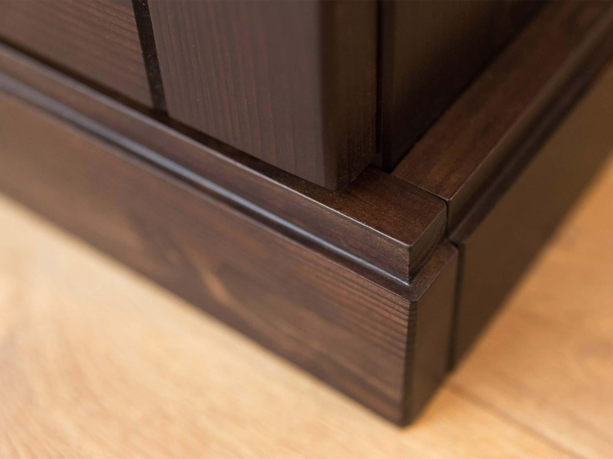 Kluczowym atutem tego modelu jest szlachetne wykończenie powierzchni, które łączy tradycyjne stolarstwo z nowoczesnymi trendami aranżacyjnymi. Zastosowanie farby wodnej w kolorze tabacco pozwala na subtelne przebijanie naturalnego rysunku drewna sosnowego, co nadaje meblowi unikalny, organiczny charakter. Frezowane fronty oraz starannie dobrane metalowe okucia w kolorze postarzanego srebra tworzą spójną kompozycję, która doskonale odnajdzie się zarówno w aranżacjach klasycznych, jak i surowych wnętrzach typu loft.