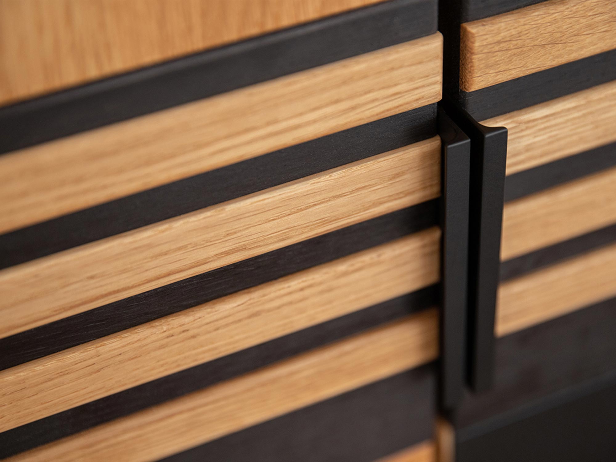 Kluczowym atutem tego modelu jest wykorzystanie szlachetnego surowca, jakim jest lity dąb, co zapewnia meblowi niepowtarzalny rysunek słojów oraz wyjątkową trwałość. Powierzchnia drewna została poddana procesowi olejowania, który nie tylko chroni materiał przed czynnikami zewnętrznymi, ale również pozwala mu „oddychać” i zachować naturalną strukturę. Kontrastujące z ciepłym odcieniem drewna czarne, matowe detale oraz lamele wprowadzają do projektu nowoczesną dynamikę, idealnie wpisując się w estetykę industrialną. Konstrukcja mebla jest niezwykle solidna, co w połączeniu z precyzyjnym wykonaniem sprawia, że jest to inwestycja na długie lata.