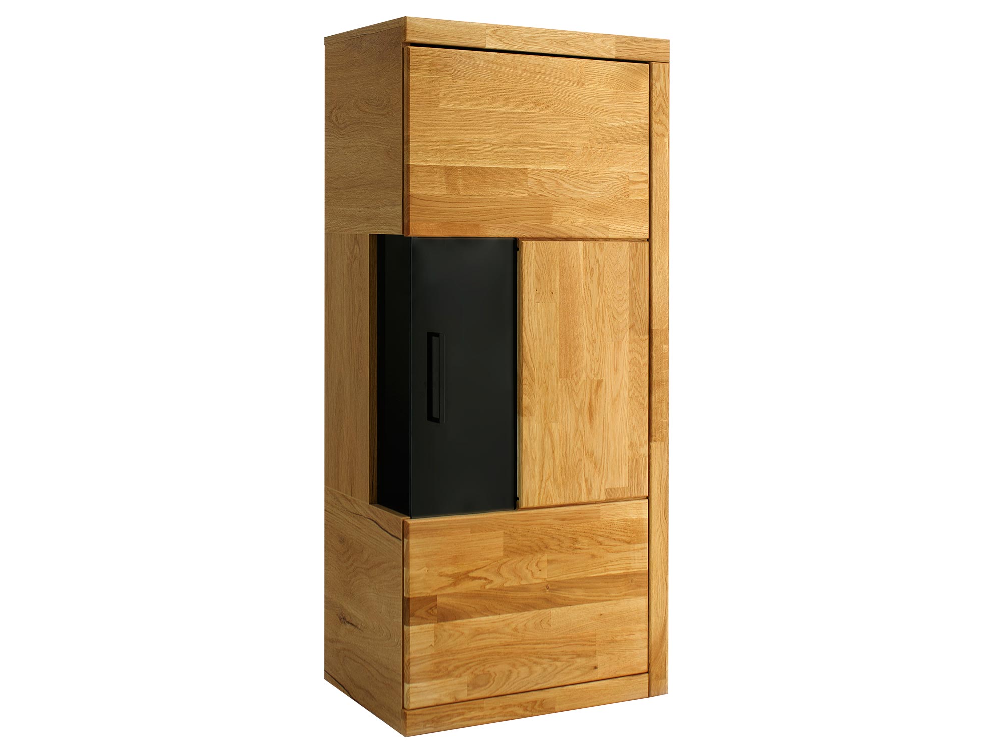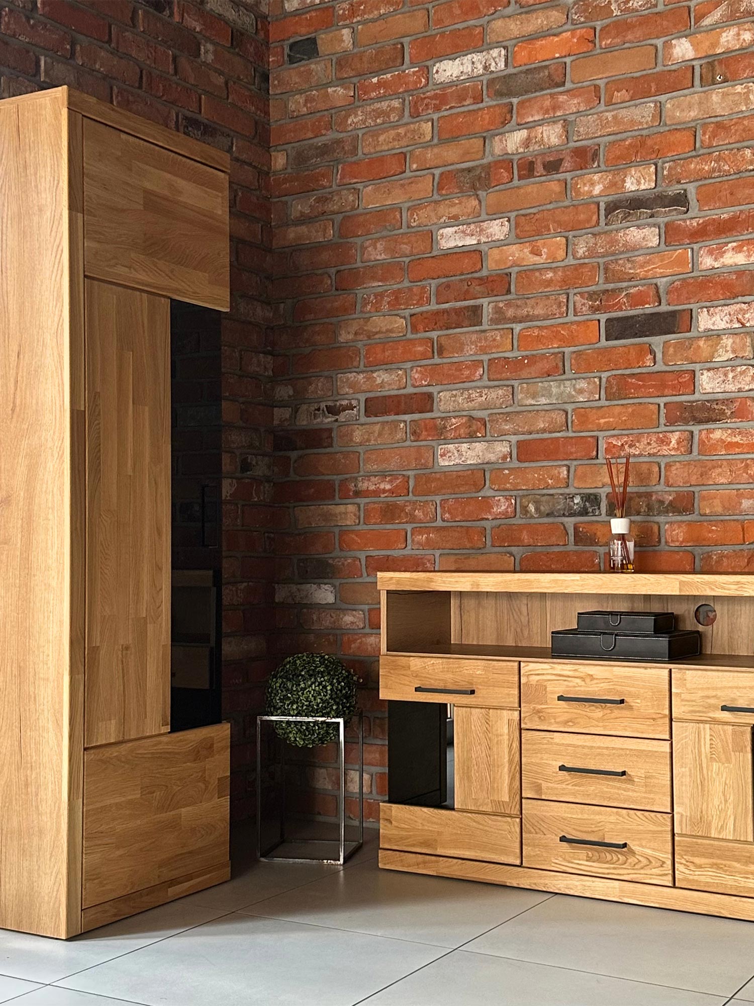 Prezentowany model wyróżnia się starannym doborem materiałów, które decydują o jego wyjątkowej trwałości i wyglądzie. Fronty wykonane z litego drewna dębowego zostały zabezpieczone naturalnym olejem, co nie tylko uwydatnia rysunek słojów, ale także chroni powierzchnię. Korpus mebla stanowi wytrzymała płyta laminowana o strukturze 3D, która idealnie odwzorowuje fakturę drewna, tworząc spójną wizualnie bryłę z elementami dębowymi. Zastosowanie bezpiecznego szkła hartowanego w drzwiach świadczy o dbałości o każdy szczegół wykonania.